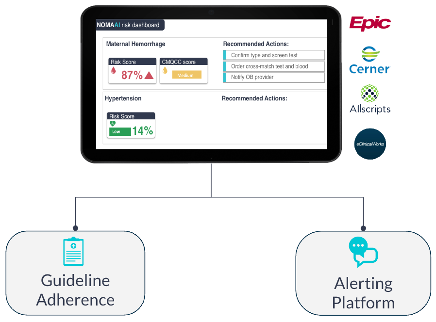 NOMA AI is developing AI algorithms for predictive monitoring and recognition of maternal hemorrhage. First and aligning with existing mandates for maternal hemorrhage risk assessment, we are addressing early risk assessment of maternal hemorrhage through real-time integration with hospital electronic health records. Starting from admission, patients' medical history, risk factors, vital signs and other clinical data will be extracted and processed by NOMA's proprietary AI platform to predict the risk of maternal hemorrhage and provide that information within existing clinical softwares and workflows. In Phase II, NOMA will address the recognition of ongoing severe bleeding by combining patients' medical records with biosensor data allowing clinicians to intervene before a patient has experienced severe bleeding for the first time.