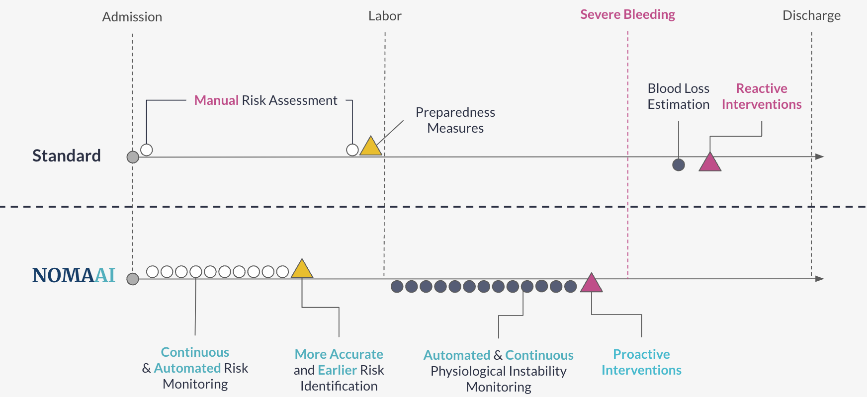 NOMA AI's maternal hemorrhage monitoring solutions offers both more accurate and earlier identification of risk and proactive recognition of severe bleeding or risk of physiological instability resulting from excessive bleeding, therefore, facilitating higher levels of preparedness and earlier proactive intervention.